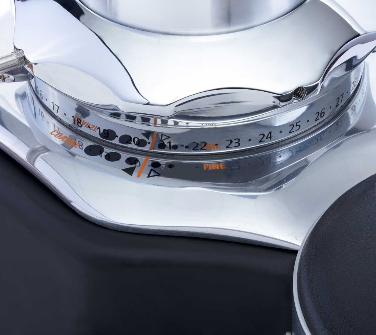 Il dosatore standard è in plastica alimentare, con un'opzione in metallo disponibile su richiesta. Inoltre, è possibile equipaggiare il dosatore con un pratico pressino telescopico frontale integrato, per facilitare la pressatura del caffè macinato nel portafiltro.