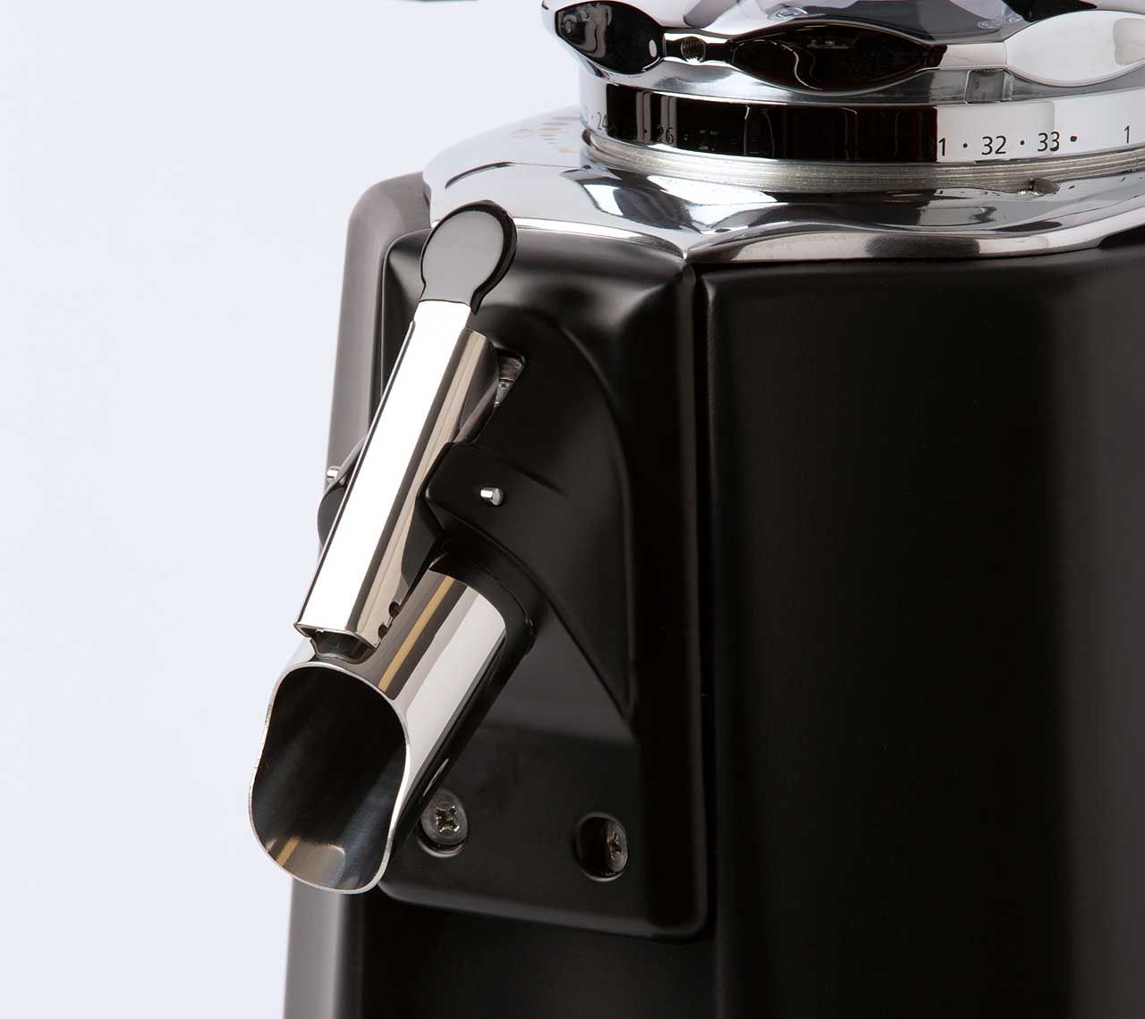 The Q13D coffee grinder is equipped with a practical coffee bag-holding spring with a rubberized end, strategically positioned above the coffee ground outlet.