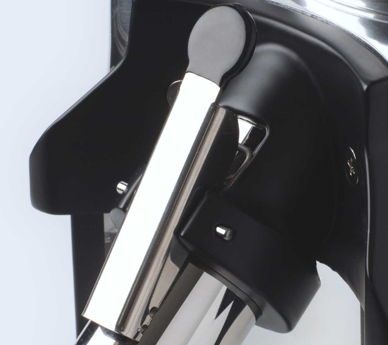 The T48D coffee grinder is equipped with a practical coffee bag-holding spring with a rubberized end, strategically positioned above the coffee ground outlet.