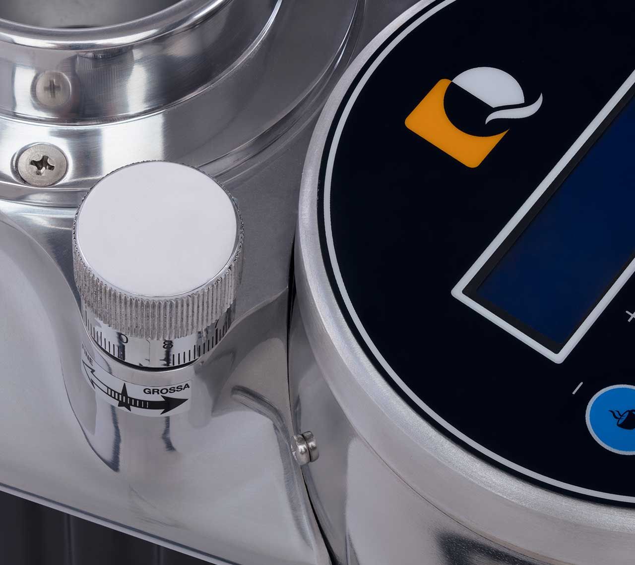 The electronic adjustment allows for three different dosage settings, while the non-resettable total dose counter ensures constant usage monitoring. The stepless micrometric grind adjustment guarantees maximum control and the perfect grind size for every need.